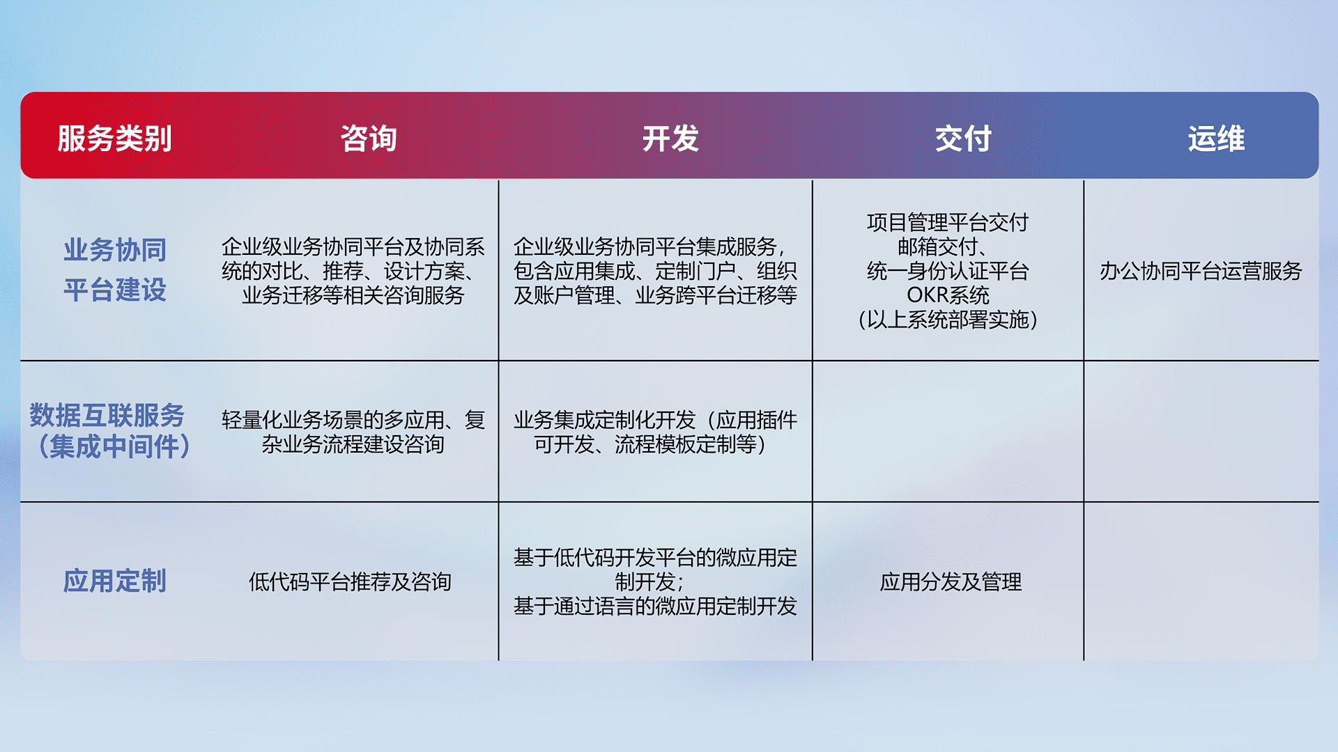 针对钉钉、、企微、、IDaas等平台级产品提供产品的规划、、、方案、、交付、、定制化开发等服务,,,实现如统一协同办公、、、、智能客户服务、、混合会议管理、、、智能数据查询、、、、等业务场景,,,,实现数字化转型。。。。